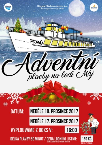 Již tuto neděli 10. prosince se uskuteční druhá adventní plavba po Máchově jezeře. Vyplouváme v 16:00 hod. z přístaviště lodi Máj v Doksech. Cena lodního lístku je 150 Kč, v ceně lístku je svařené víno a čaj. Délka plavby je 60 minut.