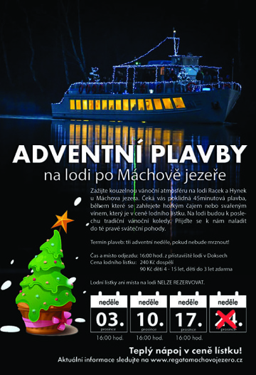jak se již stalo tradicí, tak i letos pro vás máme připravené ADVENTNÍ PLAVBY po Máchově jezeře. Vánočně vyzdobená loď, horké svařené víno, teplý čaj, pro děti drobná sladkost a české vánoční koledy vám vykouzlí úsměv na tváři.