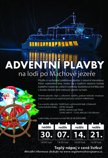 Adventní plavby po Máchově jezeře jsou okouzlujícím, pohádkovým a nezapomenutelným zážitkem. Vánočně osvětlená loď, nazdobené stromečky, vůně svařeného vína a tradiční české koledy. To vše Vás naladí do kouzelné vánoční pohody.