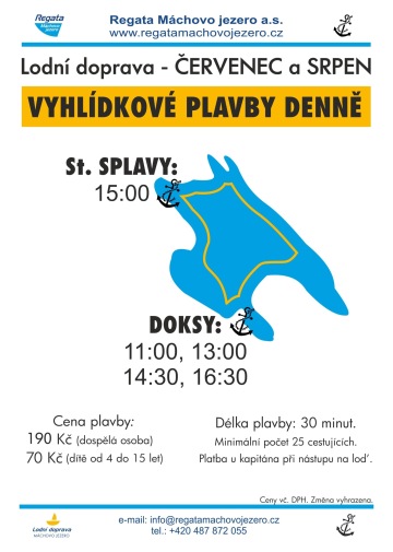 budou denně z přístaviště v Doksech v časech: 11:00, 13:00, 14:30 a 16:30 hodin. Z přístaviště ve Starých Splavech budeme denně vyplouvat v 15:00 hodin.
