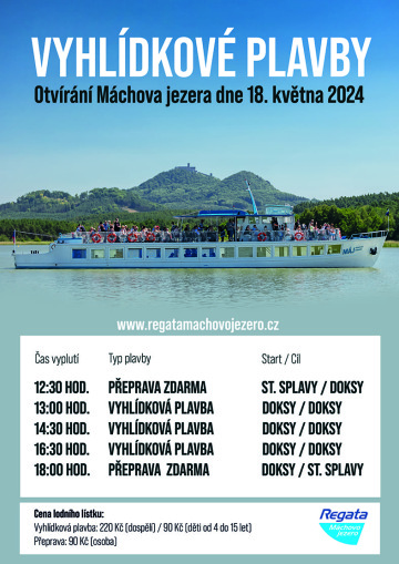 Vyhlídkové plavby dne 18. května budou z přístaviště v Doksech v těchto časech: 13:00, 14:30 a 16:30 hodin. Cena lodního lístku činí 220 Kč/dospělá osoba, 90Kč/dítě 4-15 let a senior nad 70 let - věk je nutné prokázat. Děti do 4 let mají plavbu zdarma.