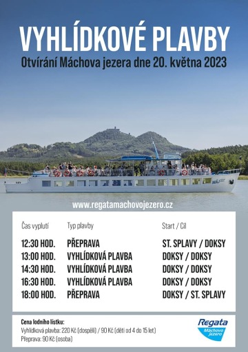 dne 20. května proběhne na hlavní pláži v Doksech tradiční Otvírání Máchova jezera. K této příležitosti jsme pro vás přichystali několik vyhlídkových plaveb z přístaviště v Doksech.