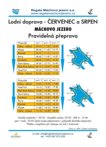 Pravidelná lodní přeprava je pouze v červenci a srpnu. Platba na lodi je možná pouze v hotovosti.