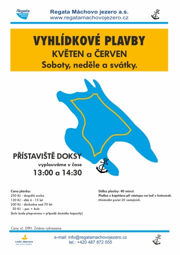 Od 1. května pro Vás budeme pravidelně plout každou sobotu a neděli v čase 13:00 a 14:30 hodin. V tyto uvedené časy budeme plout i o svátcích a to 1. a 8. května.Tyto plavby jsou uskutečněny z přístaviště v Doksech.